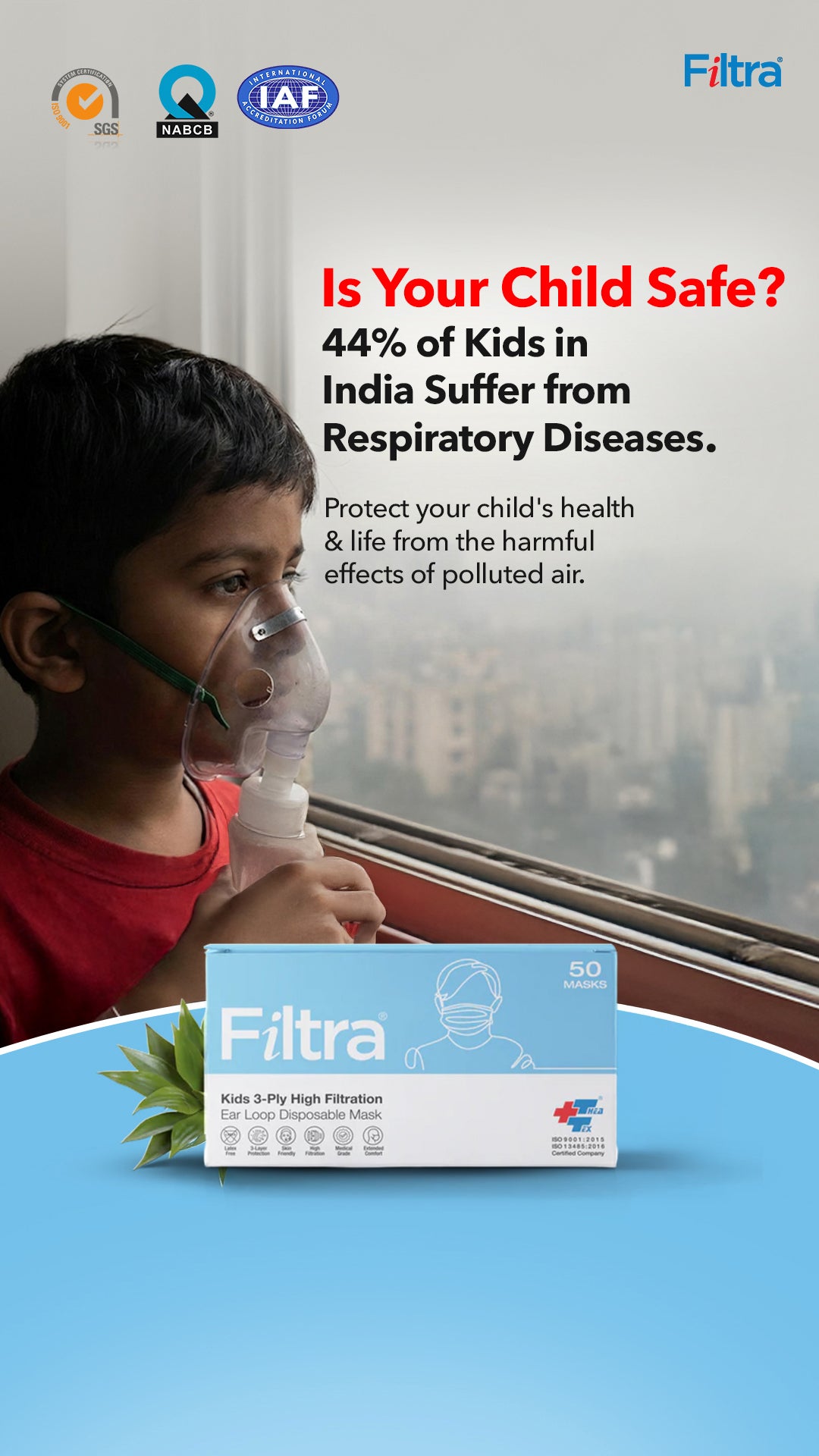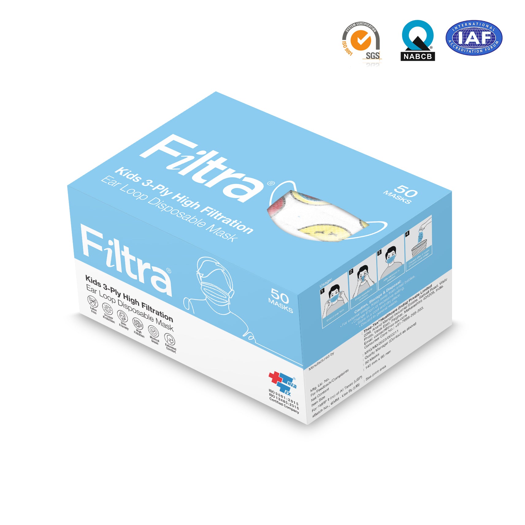 - Filtra facemasks are made with virgin medical grade technical textiles that are hypoallergenic and soft on the skin. The high performance filters provide maximum protection to the user and the environment, while remaining cool and breathable to the user. Filtra Kids/Child masks are manufactured in a smaller size to the universal mask size. Surgical Mask face fit is very important for the user, to minimise air leakage and often kids have much smaller face dimensions then adults. This is dangerous and it exposes air leakage to the kids as well as outward transmission to the environment from the child. In order to make the masks less intimidating for children, Filtraâ Kids masks are made in fun cartoon smiley face & colourful designs and in a smaller size to provide a better face fit for the child. This range of mask is widely used in leading hospitals’ children’s wards and also some of the largest and most distinguished and reputed children’s hospitals. Performance Features: Bacterial Filtration Efficiency (BFE) - ASTM F 2101 > 99% Splash/Fluid Resistance 160 mmHg – ASTM F1862 Low Breathing Resistance (Delta P) - MIL-M-36954C Flammability (Class 1) – 16 CFR Part-1610 Expiry: Use within 3 years of manufacturing date Usage: Extend over face, press nose clip in position, affix ear loops in position Warnings: Discard after 8 hours continuous use