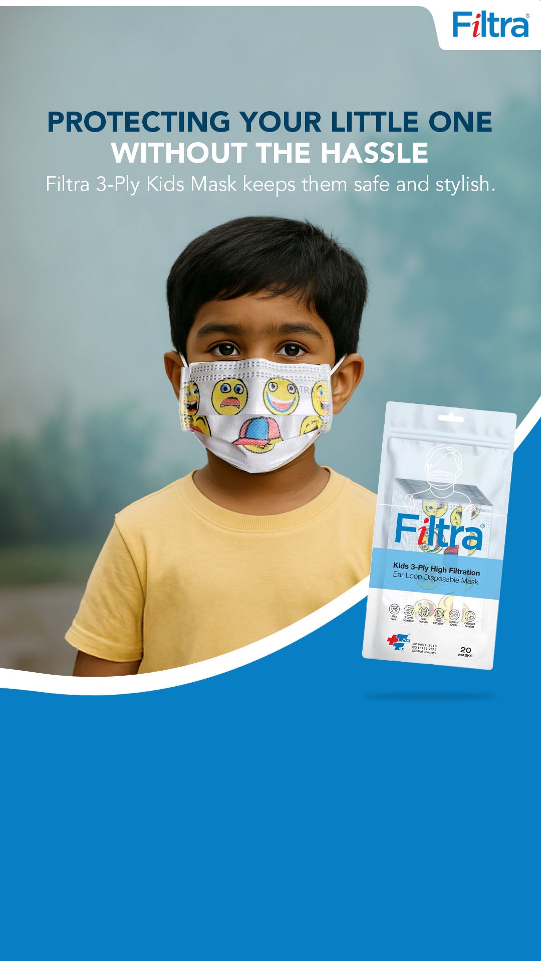 Filtra facemasks are made with virgin medical grade technical textiles that are hypoallergenic and soft on the skin. The high performance filters provide maximum protection to the user and the environment, while remaining cool and breathable to the user. Filtra Kids/Child masks are manufactured in a smaller size to the universal mask size. Surgical Mask face fit is very important for the user, to minimise air leakage and often kids have much smaller face dimensions then adults. This is dangerous and it exposes air leakage to the kids as well as outward transmission to the environment from the child. In order to make the masks less intimidating for children, Filtraâ Kids masks are made in fun cartoon smiley face & colourful designs and in a smaller size to provide a better face fit for the child. This range of mask is widely used in leading hospitals’ children’s wards and also some of the largest and most distinguished and reputed children’s hospitals. Performance Features: Bacterial Filtration Efficiency (BFE) - ASTM F 2101 > 99% Splash/Fluid Resistance 160 mmHg – ASTM F1862 Low Breathing Resistance (Delta P) - MIL-M-36954C Flammability (Class 1) – 16 CFR Part-1610 Expiry: Use within 3 years of manufacturing date Usage: Extend over face, press nose clip in position, affix ear loops in position Warnings: Discard after 8 hours continuous use