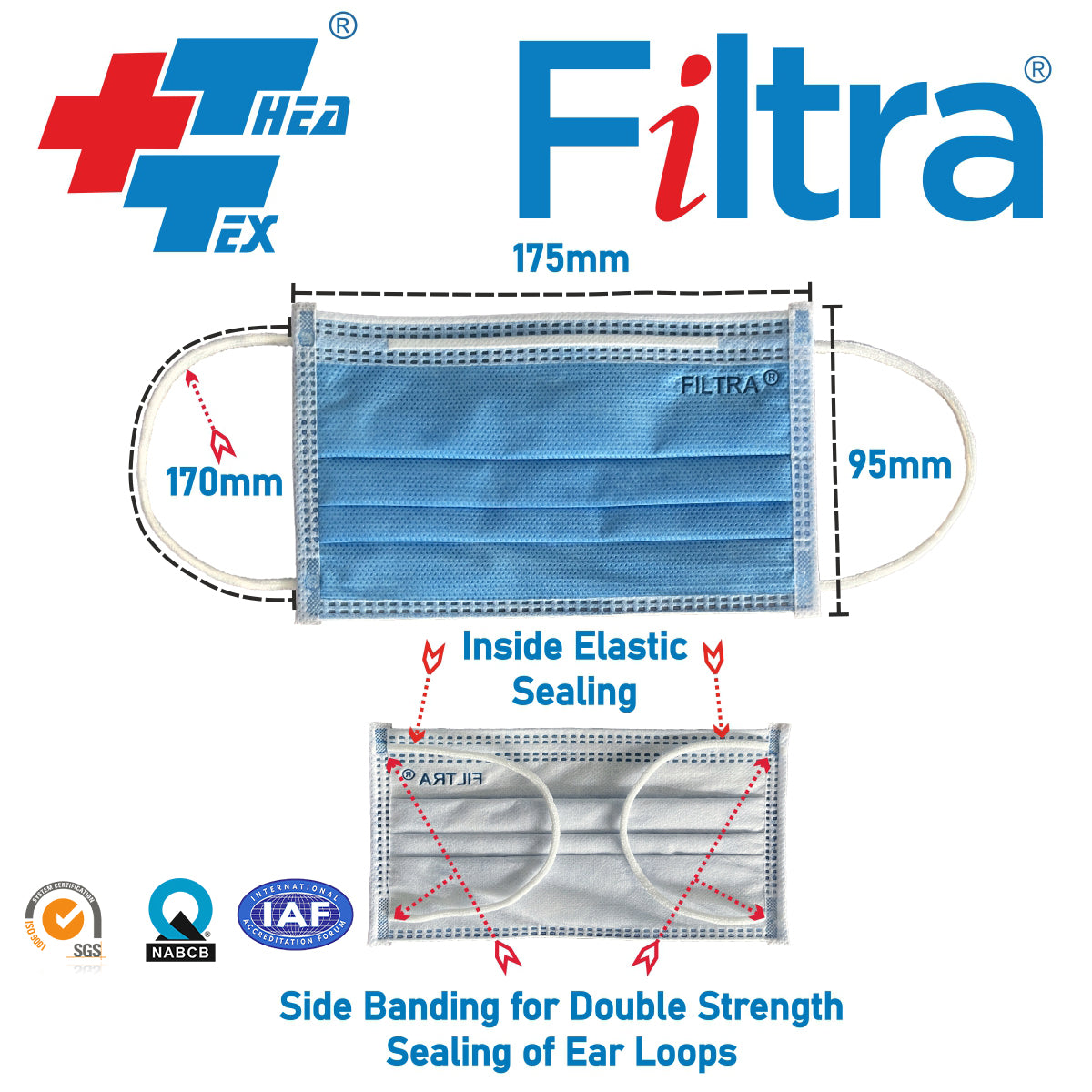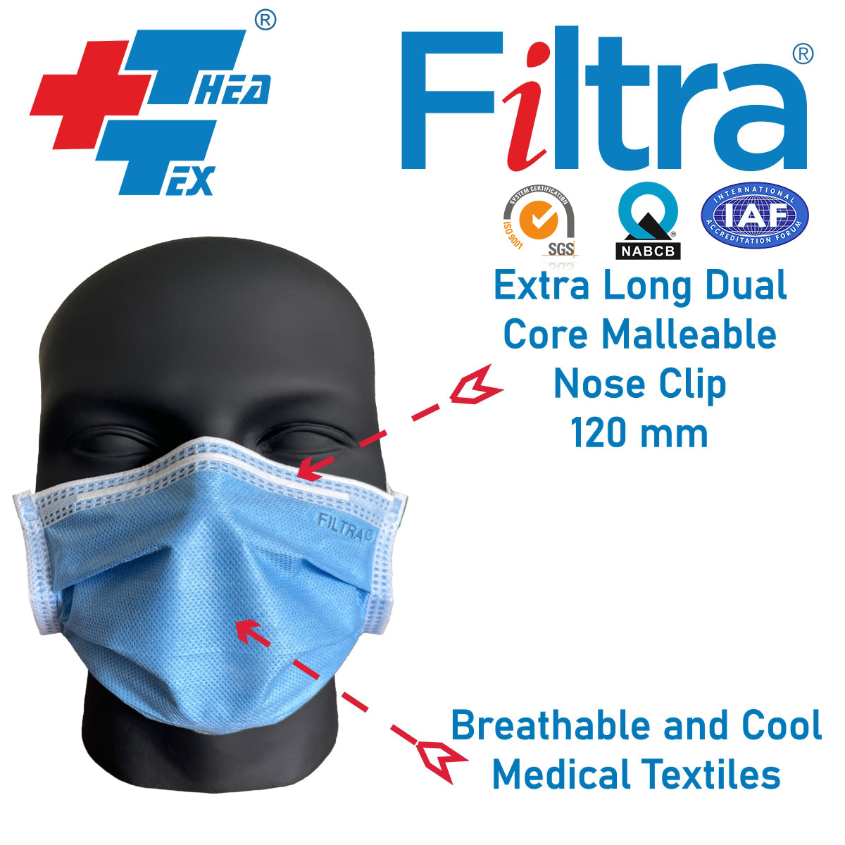 FILTRA® 3-Ply Ear Loop Surgical Mask is a high filtration premium quality surgical mask brand since the last two decades. The triple layer is mask is ultrasonically manufactured from virgin medical grade technical textiles, making the mask breathable and cool to wear. FILTRA® ear loop masks have inside mask sealing with side banding to provide extra sealing strength to the ear bands. The fabric used is non liniting and non irritating hypoallergenic medical fabric, tested for biocomatibility. Each layer of the mask is a minimum of 25 Gsm, with a middle layer of electrostatically charged Meltblown, giving the mask a very high filtration level > 99% against particles and bacetria as small as 0.1 microns. The elastic is a generous length of minimum 18 cm so that it is comfortable but also fits well with minimum leakage. FILTRA® masks have an extra long soft and malleable PE coated dual core aluminium nose clip which can be moulded easily to give a secure face fit and minimise air leakage and fogging of specs. FILTRA® 3-Ply Ear Loop Surgical Mask adheres to ASTM F2100, EN 14683, IS 16289. Bacterial Filtration Efficiency (BFE) - ASTM F 2101 > 99%, Particle Filtration Efficiency (PFE) - ASTM F2299 > 98%, Splash/Fluid Resistance 160 mmHg – ASTM F1862 Low Breathing Resistance (Delta P) - MIL-M-36954C Flammability (Class 1) – 16 CFR Part-16102 EN 14683 Type IIR, CE Marked as per MDR.