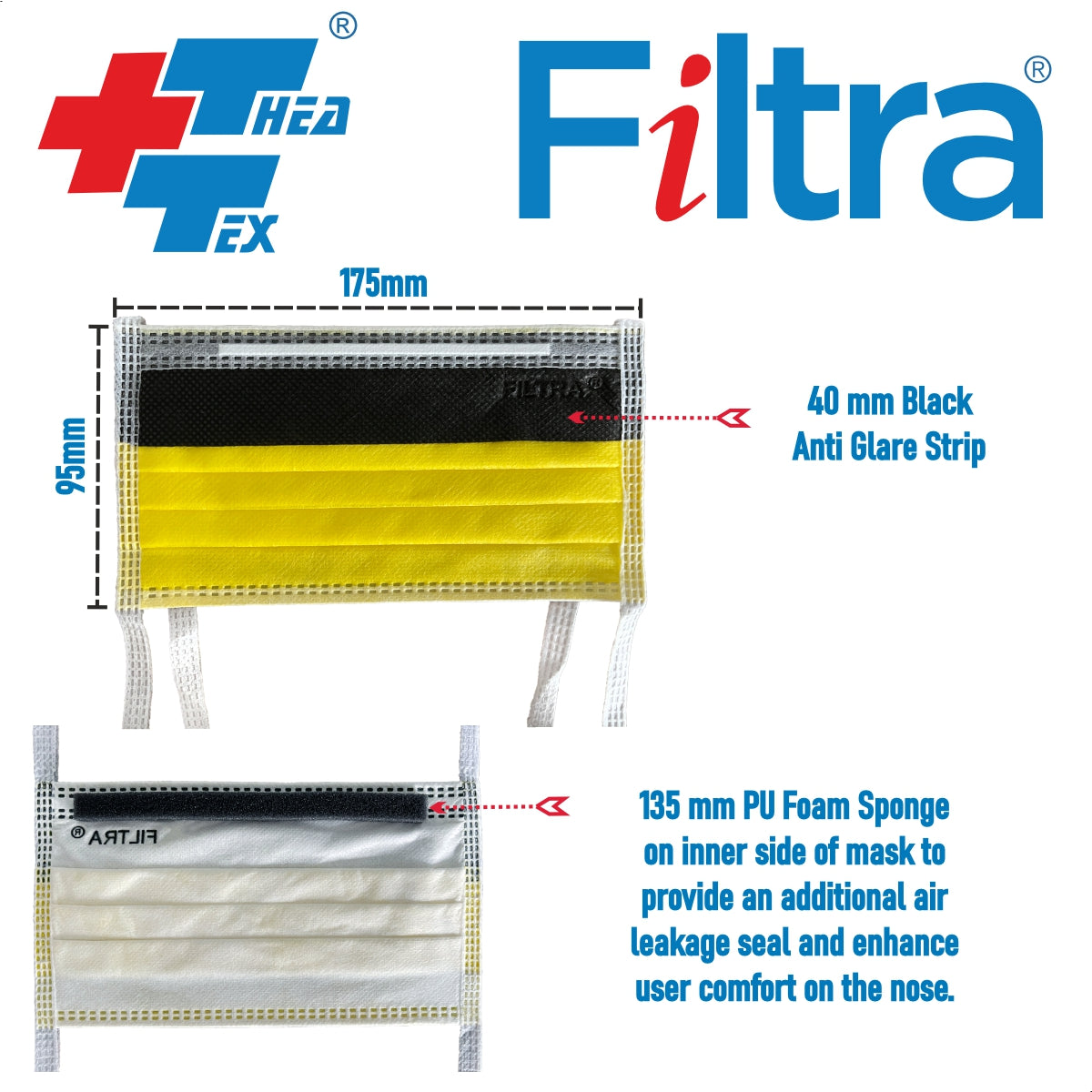 40 gsm strong ties. Extra long twin core soft nose clip for secure face fit reduces air leakage and our masks ensure a snug and secure fit for all-day wear without compromising comfort.