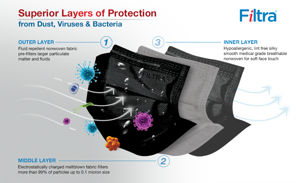 High quality filter layers ensure that the mask remains breathable even while filtering our >99% particles.