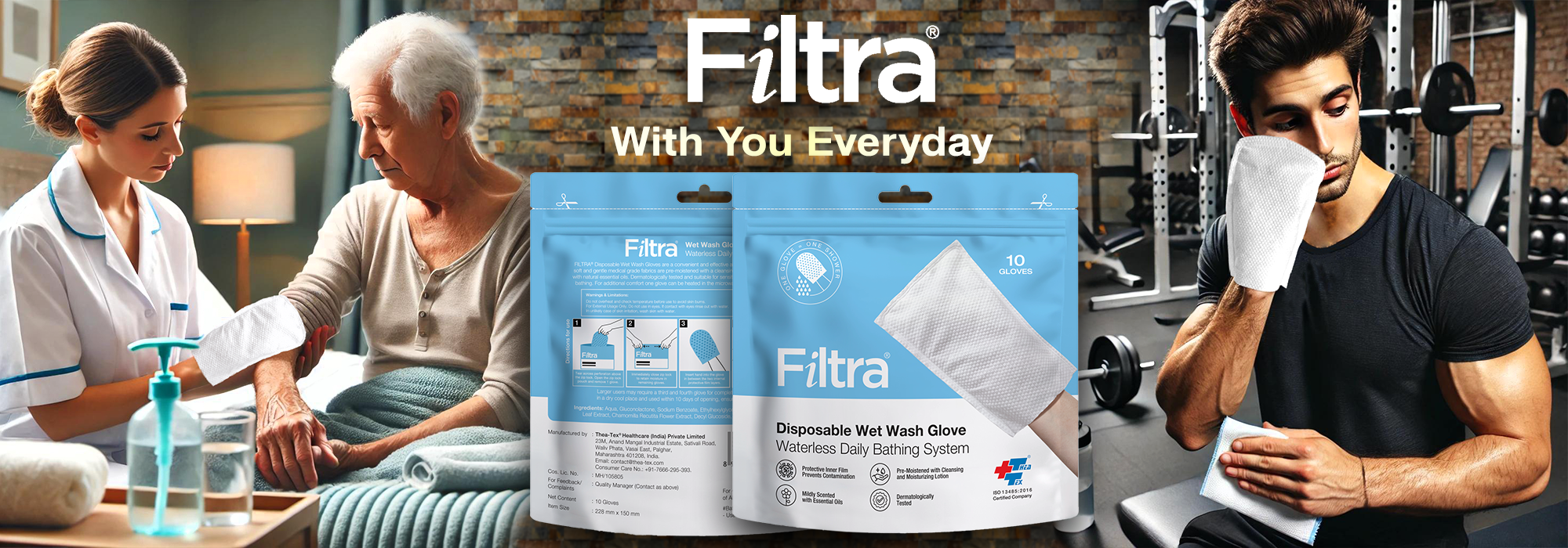 FILTRA Disposable Wet Wash Glove – The Ultimate Convenience for Hygiene on the Move Introducing the FILTRA Wet Wash Glove – your no-water-needed solution to staying fresh wherever you are. Perfect for caregivers or adventurers alike, our bathing glove offers a full clean with the simplicity of just two gloves. Water-Free Bathing System: Enjoy a full-body cleanse without any water, ideal for convenient bed baths or showers when you're on the move. Mild and Gentle: Safe for every part of your body, these gloves are perfect for any situation, from the face to intimate areas, and even for cleaning various surfaces. One-Stop Clean: Two gloves equal one thorough bath, giving you a convenient and comprehensive clean in any setting. Caring Ingredients: Soothing aloe vera and essential oils in a pH-balanced formula cater to sensitive skin for a gentle touch. Hypoallergenic and Safe: Without alcohol, chlorine, parabens, or latex, these gloves are made for all skin types. Deep Clean Fabric: The embossed, thick, and dotted texture allows for an effective clean, lifting away all dirt, sweat, and odors. Inner Protective Film: The glove is laminated inside to prevent contamination Usages: Versatile Use: Ideal for the elderly, patients, or anyone needing assistance with bathing, and equally perfect for athletes or active individuals needing a quick refresh. Travel Friendly: A travel essential for those on the go, from daily commutes to extended adventures. For the Whole Family: From parents to kids, these gloves offer a convenient clean for the entire family. Multi-Use: Beyond personal care, they’re great for wiping down gym equipment, car interiors, or any surface that needs a quick clean. Directions for Use: Open, wipe, and dispose. It’s that simple. Place your hand in the glove, clean as needed, and then throw it away. Repeat with the second glove if necessary. FILTRA Wet Wash Glove – Hygiene Anytime, Anywhere, for Everyone.