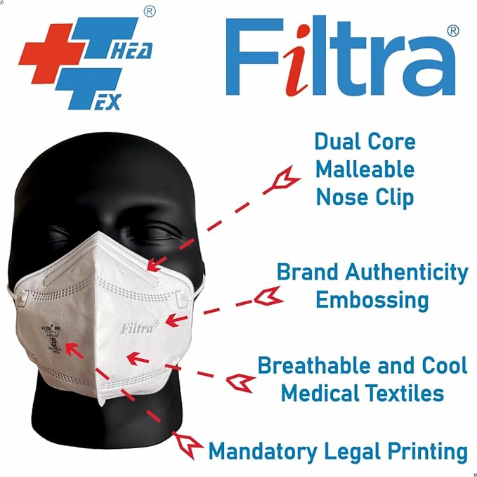 FILTRA N95 Mask with Ear Loops is a high filtration 5 layer BIS certified particulate respirator mask. The mask has an ergonomic design to fit all face sizes and shapes. The fabric is hypoallergenic, soft and very breathable and cool. The extra thick ear loops are soft, stretchy, round, latex free lycra elastic, which are very comfortable when worn for extended periods. The PE coated nose clip can be pressed gently around the nose to prevent air leakage. This certified mask with ear loops is an alternative to the FILTRA N95 with headbands, for users who prefer to use ear loops for easy donning and removal.